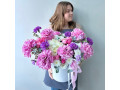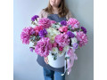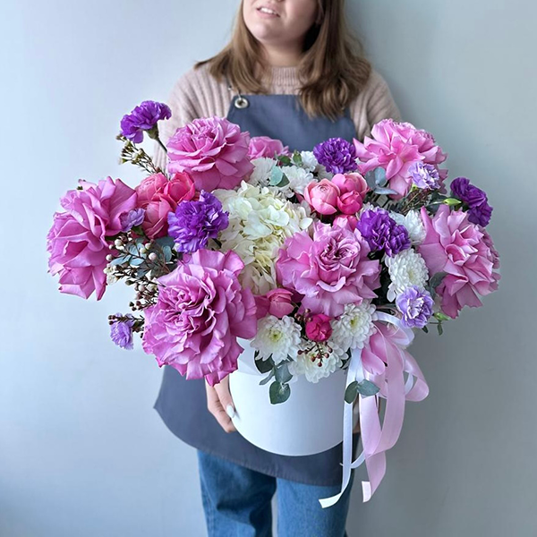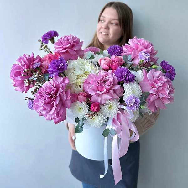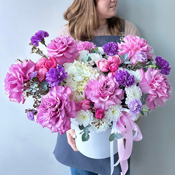 Композиция в шляпной коробке с французскими розами и лунными диантусами № 131 от 8990