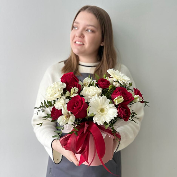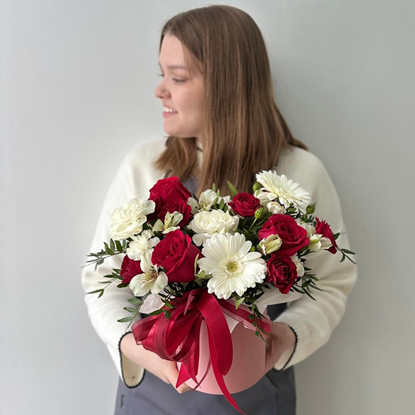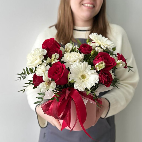 Композиция в шляпоной коробке с красными розами и белыми герберами № 67 от 3250
