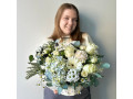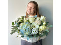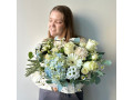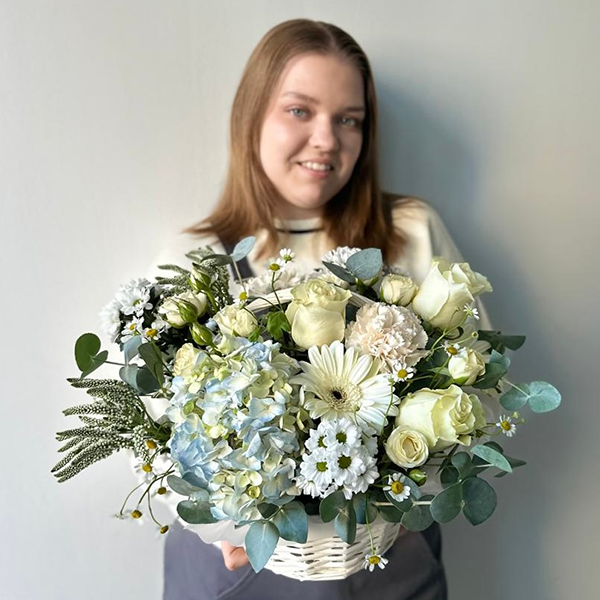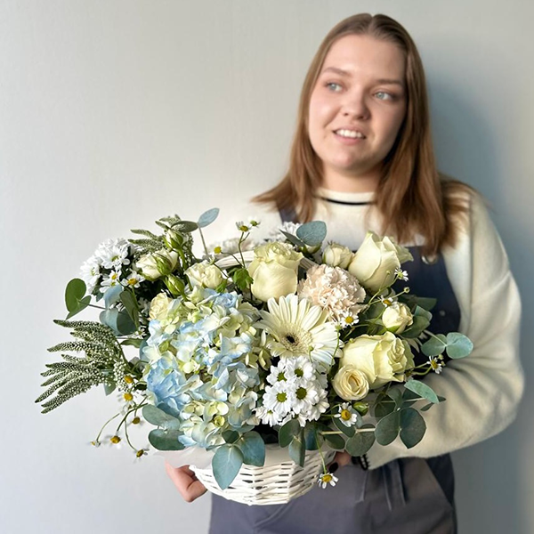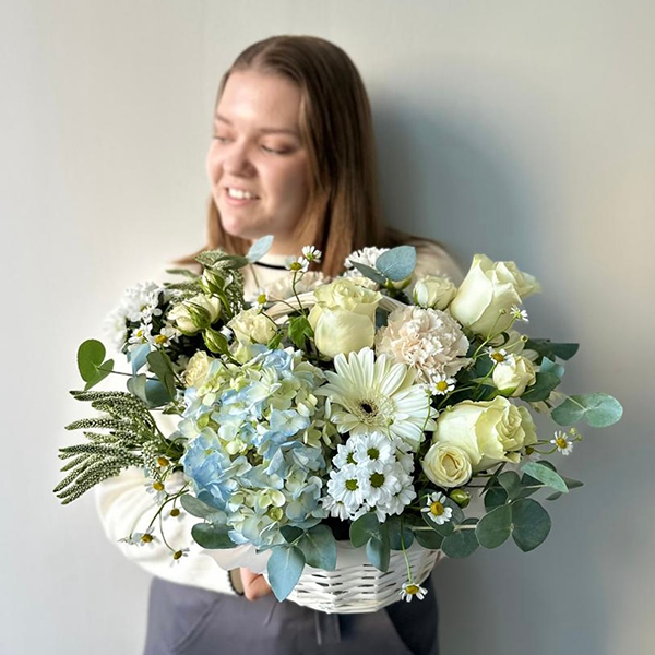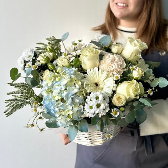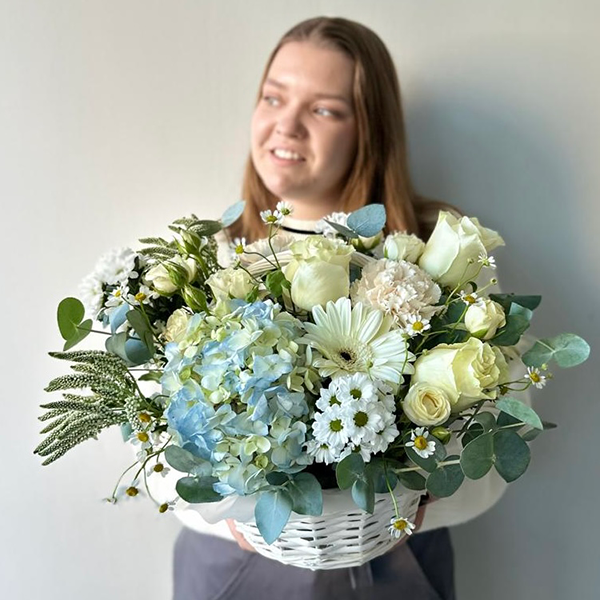 Корзина с голубой гортензией, белыми розами и герберой от 5600