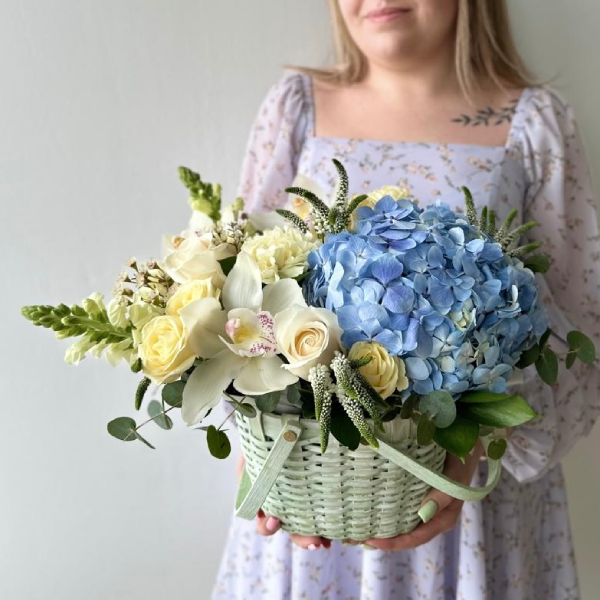 Гортензия, орхидея, роза, роза, роза кустовая, антирхинум, гиперикум, эвкалипт