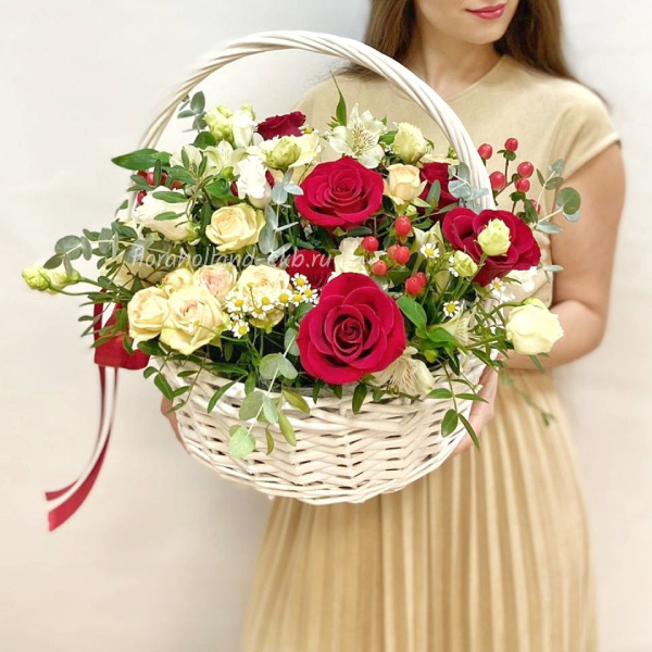 Роза, кустовая роза, альстромерия, гиперикум, танацетум, эустома, эвкалипт, фисташка