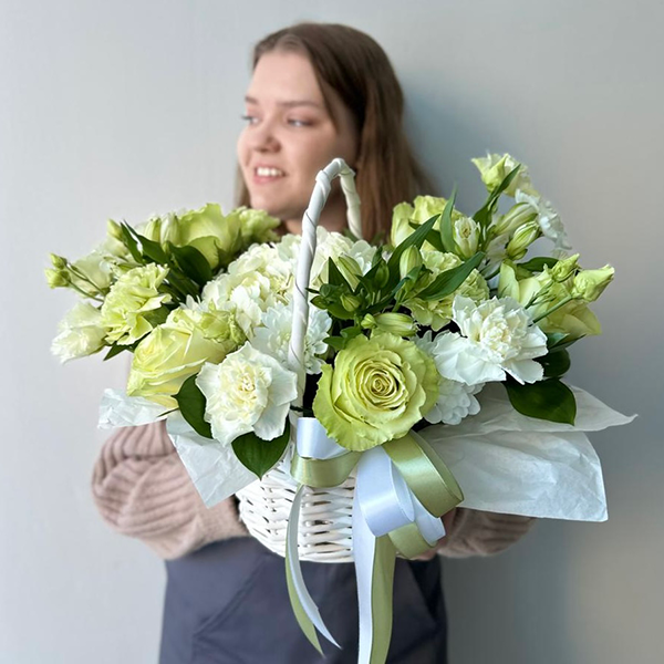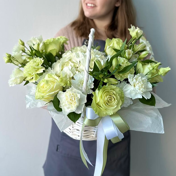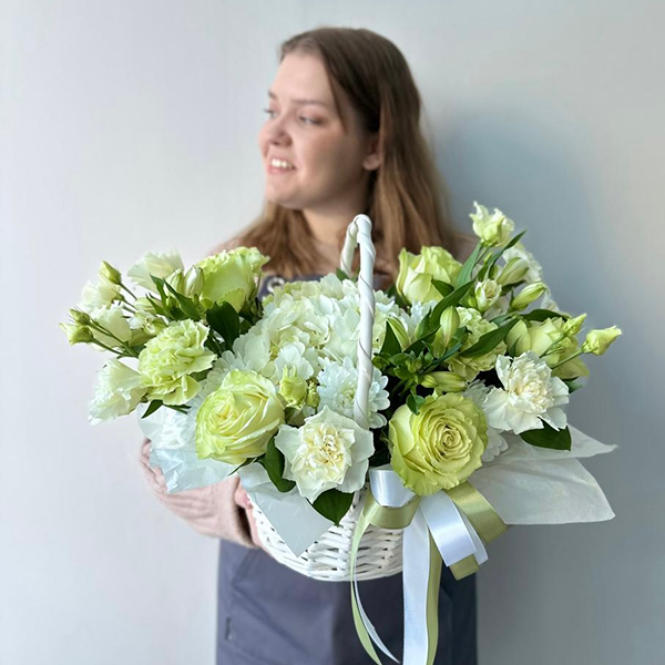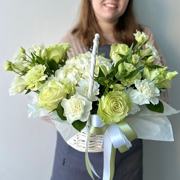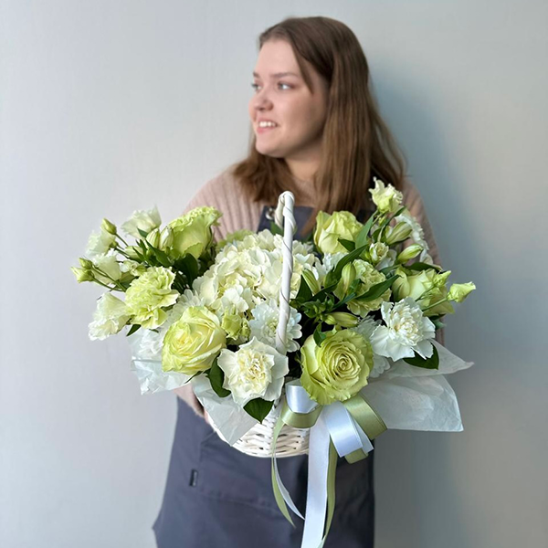 Корзина в бело-зеленом цвете с гортензией и розами