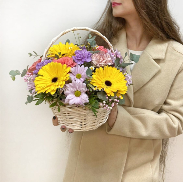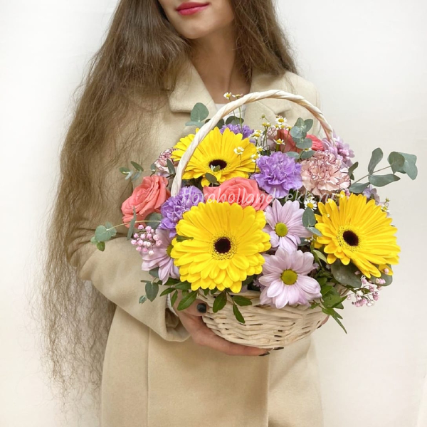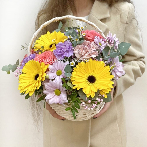 Гербера, роза, диантус, танацетум, гипсофила, хризантема, эвкалипт, фисташка
