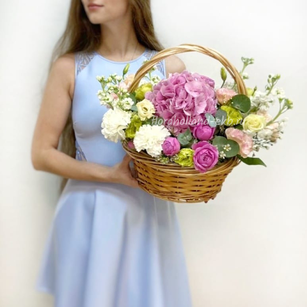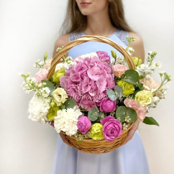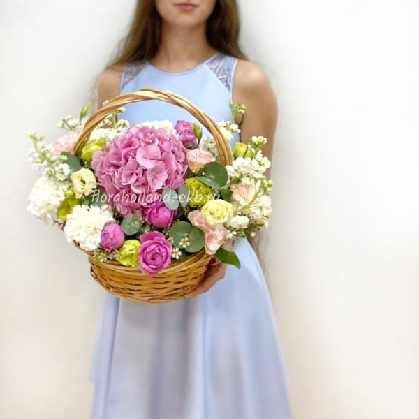 Корзина с гортензией и эустомой
