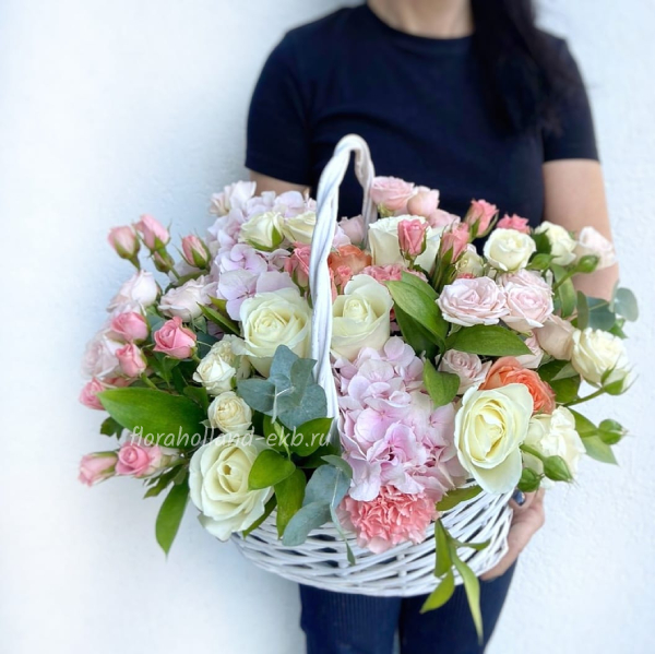 Гортензия, роза, роза кустовая, роза кустовая пионовидная, диантус, эвкалипт, рускус