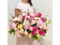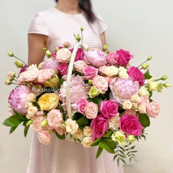 Корзина с розовыми пионами и розами