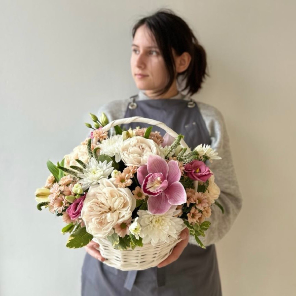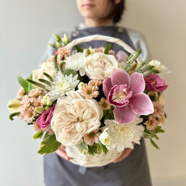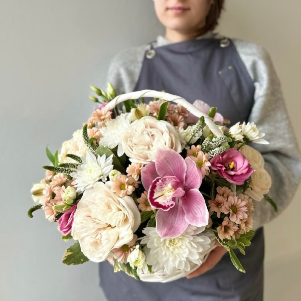 Роза пионовидная, роза кустовая пионовидная, орхидея, хризантема, эустома, вероника, питтоспорум