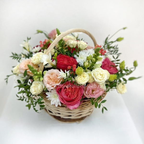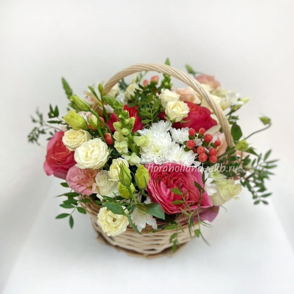 Роза пионовидная, роза кустовая, антирхинум, гиперикум, эустома, хризантема, фисташка