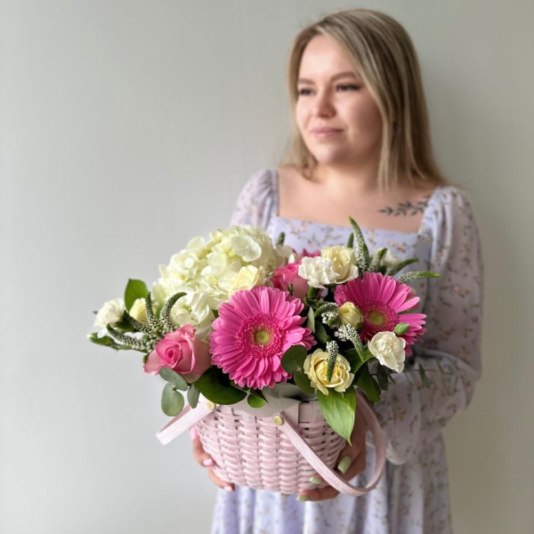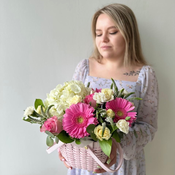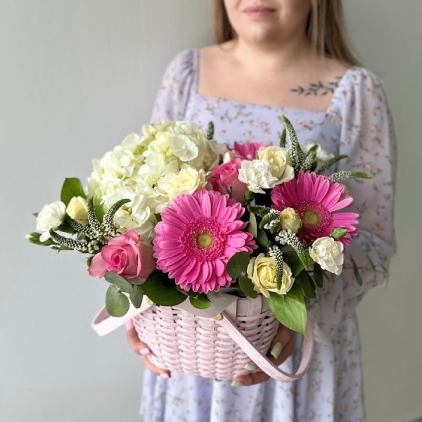 Гортензия, гербера, роза, роза, роза кустовая, вероника, диантус, эвкалипт, рускус