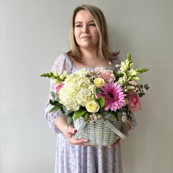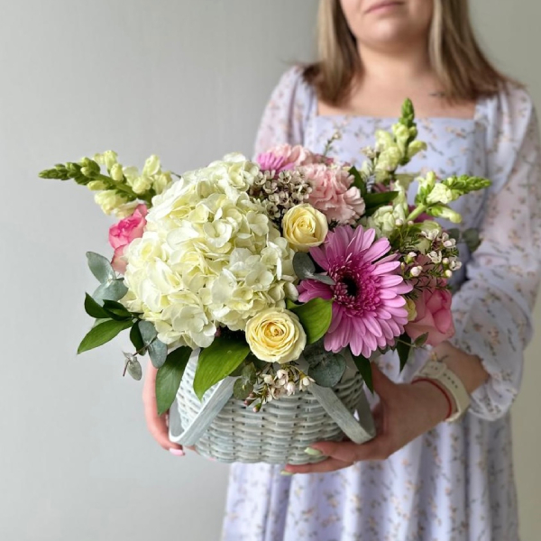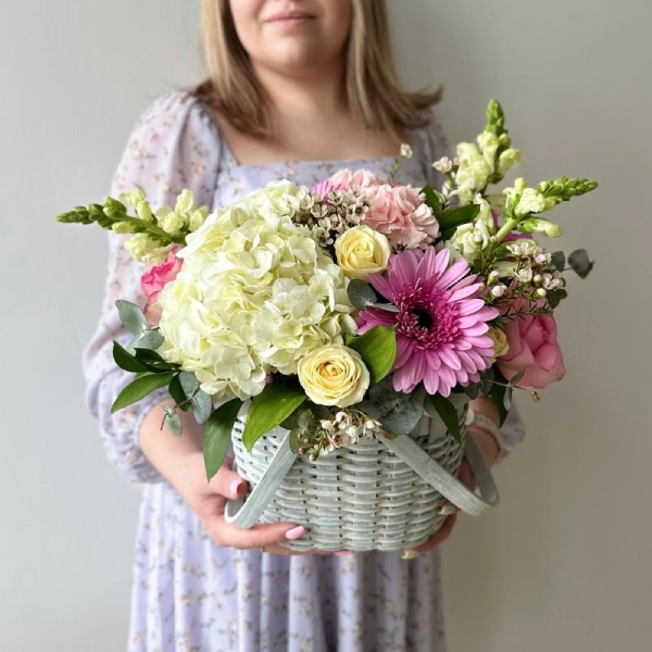 Лукошко с гортензией и диантусами Летняя коллекция от 3950