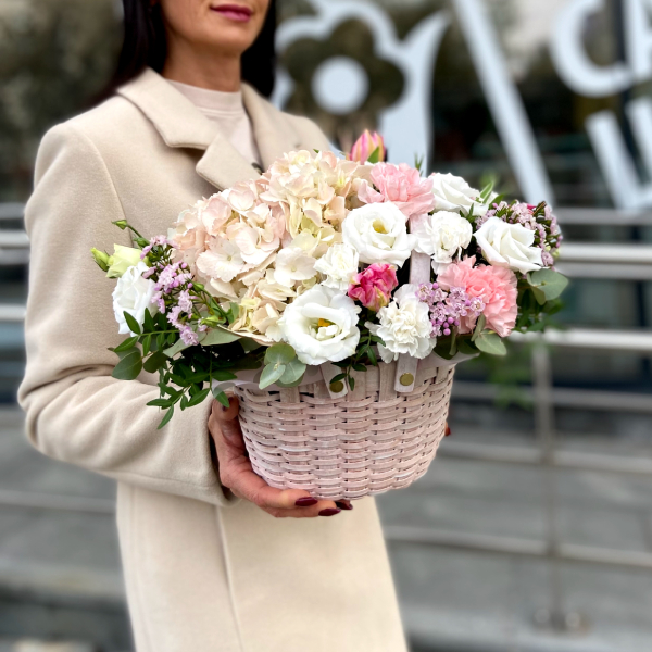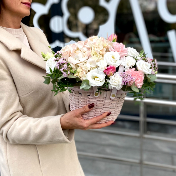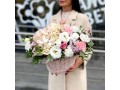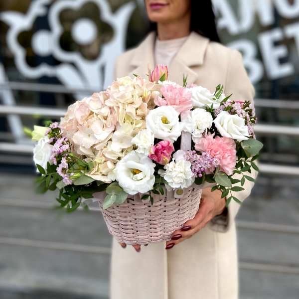 Гортензия, эустома, диантус, тюльпан или роза, ваксфлауэрс, эвкалипт, фисташка