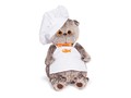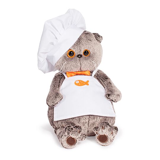 Шеф-повар кот Басик одет в поварской колпак, белоснежный фартук с вышивкой на грудке в виде золотой рыбки, на шее — атласный галстук‑бабочка золотистого цвета.