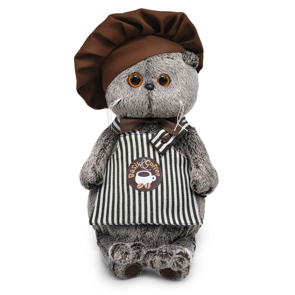 Кот Басик бариста в стильном фартуке из плотной х/б ткани в бело-коричневую полоску. На фартуке оригинальный принт с чашечкой кофе, кофейными зёрнами и надписью "Basik&Coffee". На коте объёмный колпак из смесовой ткани кофейного цвета, а также галстук-бабочка в тон из шелковистого сатина.