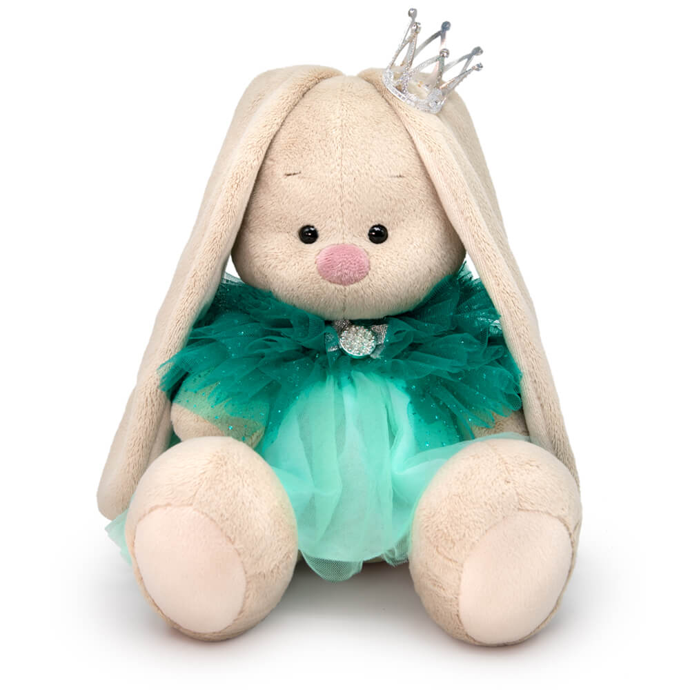 Принцесса Зайка Ми в мятном платье. Платье из тонкой ткани с верхним слоем из нежной сеточки цвета бирюзовой воды. Платье украшает пышный воротник‑жабо из нефритовой сеточки с блестящими вкраплениями и серебристый бант с шикарной брошью со стразами. На голове у Зайки серебряная корона с кристаллами.