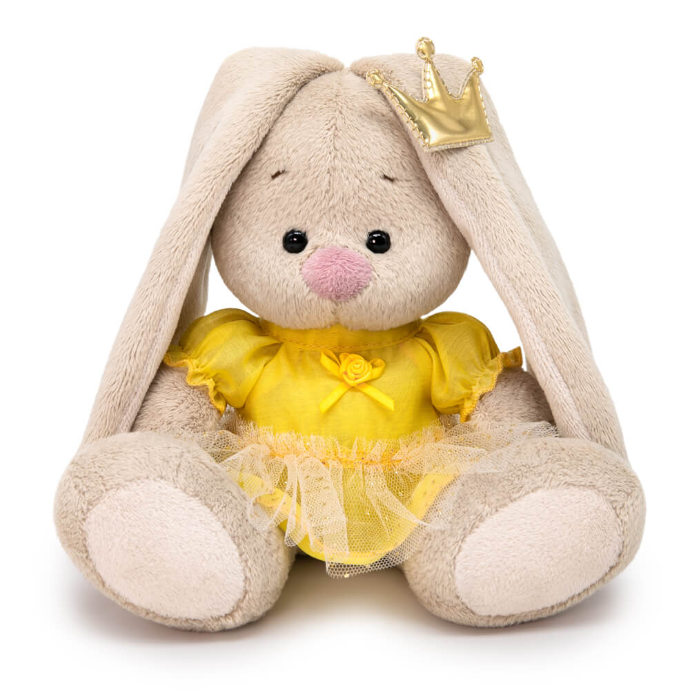 Принцесса Зайка Ми в желтом платье. Платье из тонкой ткани, с рукавом фонарик и верхней оборкой по низу из нежной сеточки с золотистым блеском. Спереди платье украшает желтый атласный бантик с розочкой. На голове у малышки Зайки Ми золотистая корона.