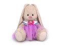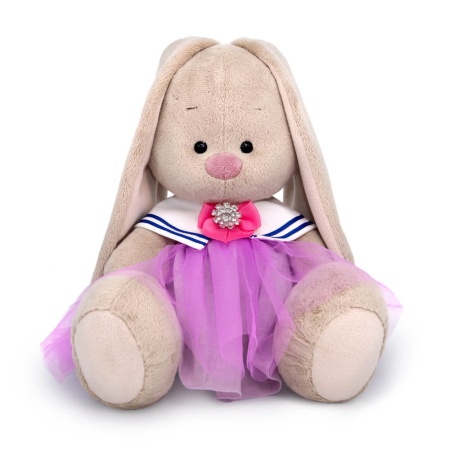 Зайка Ми в нарядном комплекте с пышной двойной юбочкой и съемным воротником в морском стиле. Верхняя юбочка сшита из тончайшей сеточки цвета орхидеи, нижняя — из нежно‑сиреневой марлевки. Воротник украшен бело‑синей тесьмой и шикарным аксессуаром в виде репсовой розовой ленты и дорогой броши, усыпанной стразами.