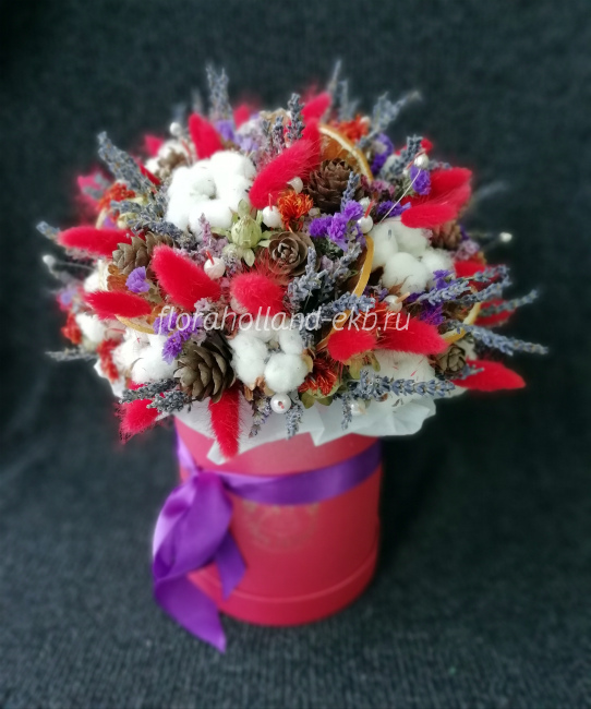 Хлопок, лагурус, статица, картамус, лаванда, шишки, апельсин, бусины