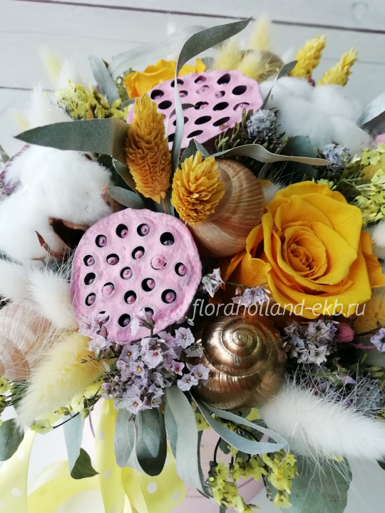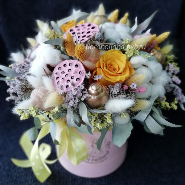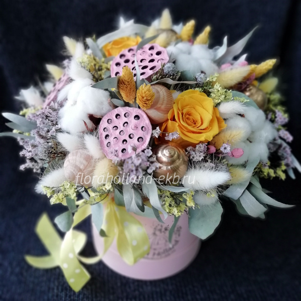 Роза стабилизированная, лотос, хлопок, лагурус, лимониум, эвкалипт, статица, лимониум, колосья, раковины