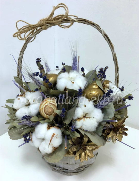 Корзинка d16 см, лаванда, хлопок, эвкалипт, колоски, раковины, шишки
