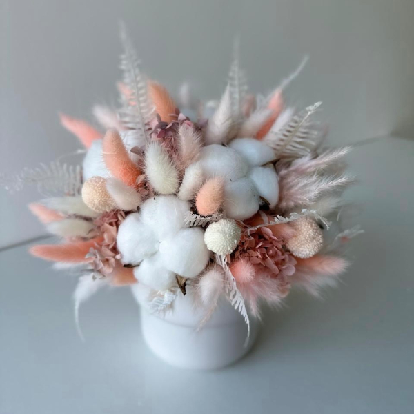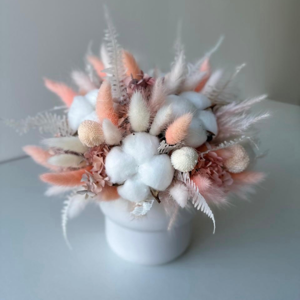 Гортензия стабилизированная, папоротник, хлопок, лагурус, краспедия