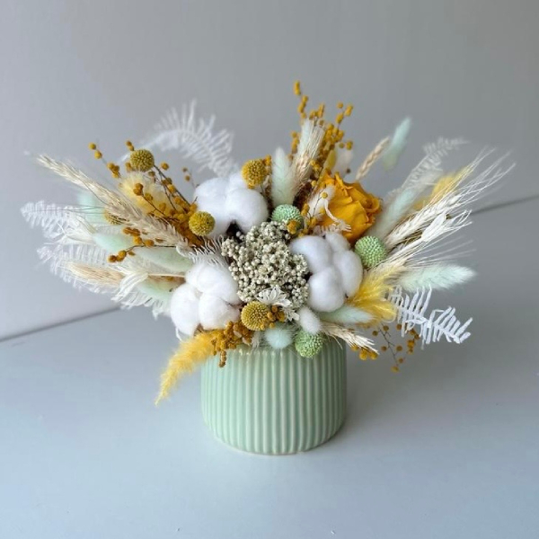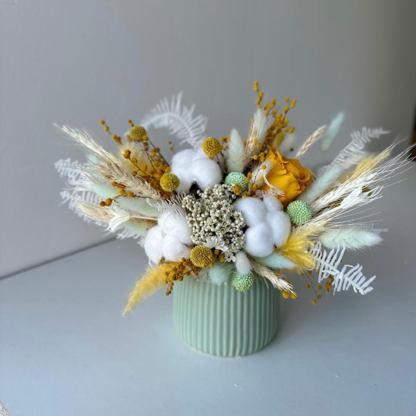 Роза стабилизированная, папоротник, хлопок, лагурус, озотамнус, колоски, краспедия