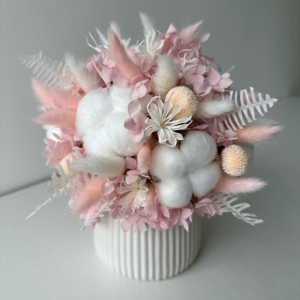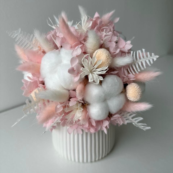 Гортензия стабилизированная, папоротник, хлопок, лагурус, краспедия