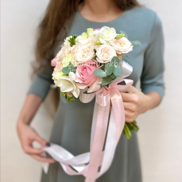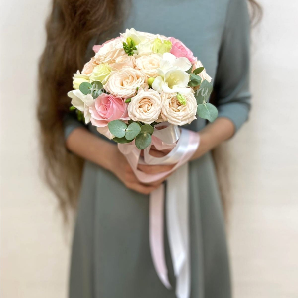 Букет невесты из нежных пионовидных кустовых роз с ароматным эвкалиптом "Трис" от 3650