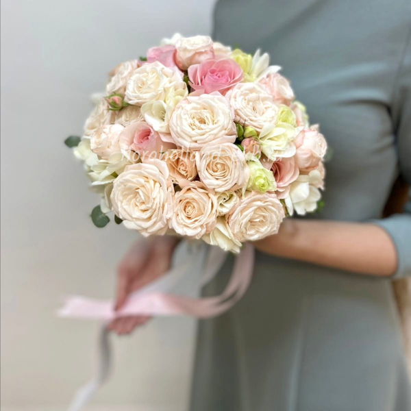 Букет невесты с кремовыми пионовидными розами и эустомами "Стефана" от 3990