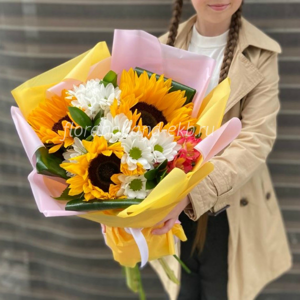 Подсолнух, хризантема, альстромерия, аспидистра, рускус, упаковка, лента атласная
