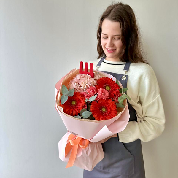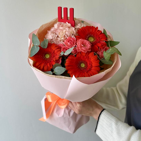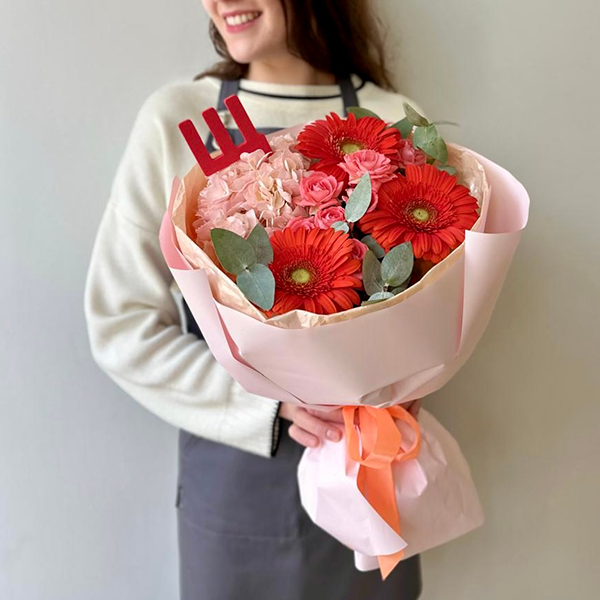 Гортензия, гербера, роза кустовая, эвкалипт, упаковка, лента атласная