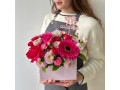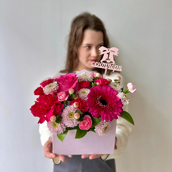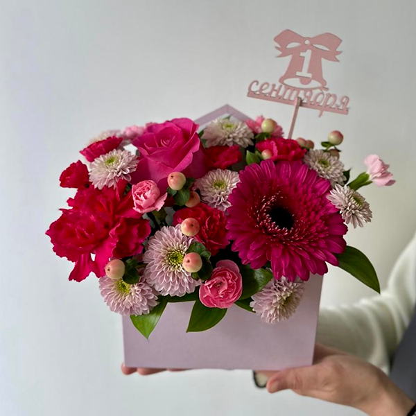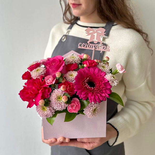 Роза, гербера, хризантема, диантус, гиперикум, рускус