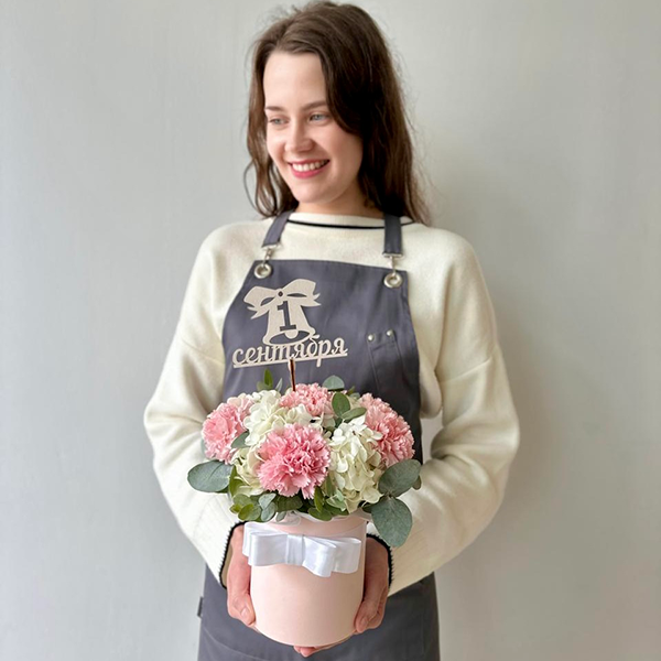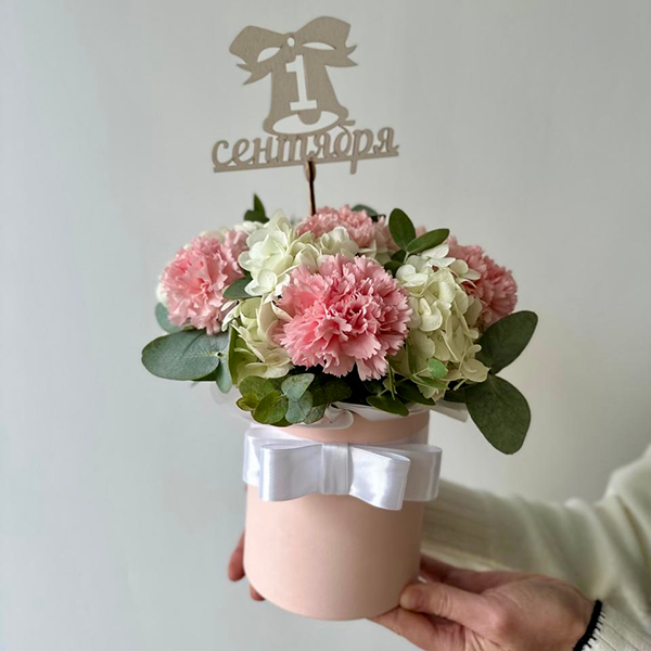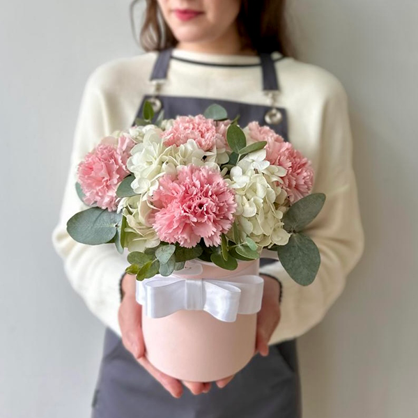 Композиция в шляпной коробке с гортензией и диантусами от 2400