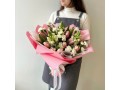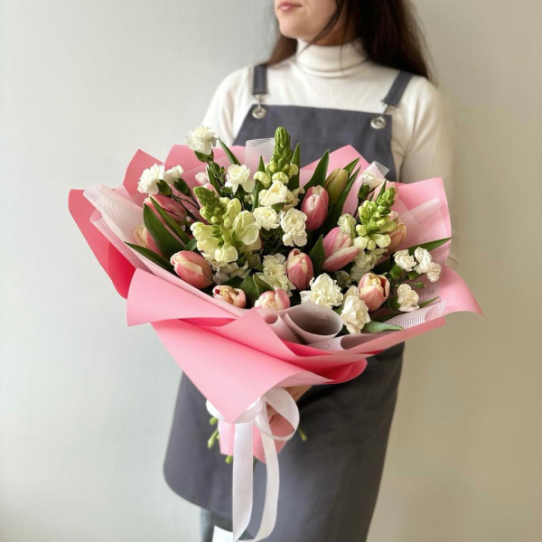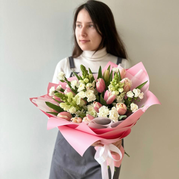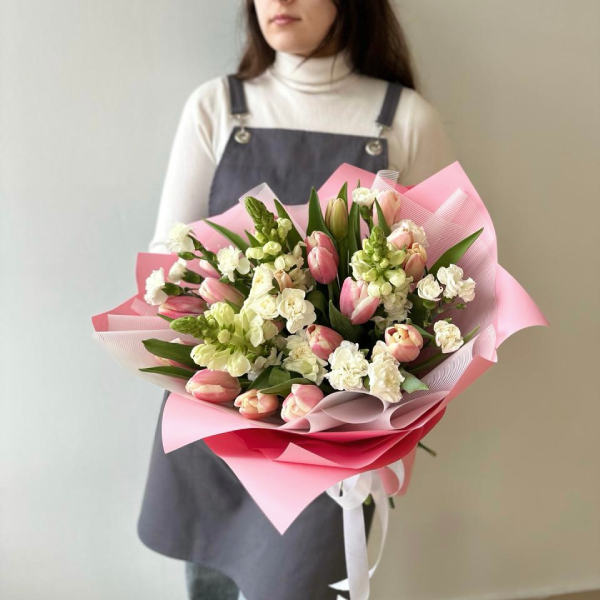 Тюльпан, антирхинум или маттиола, диантус, упаковка, лента атласная