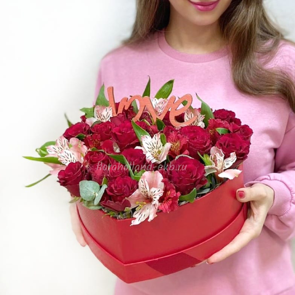 Роза, роза кустовая, альстромерия, зелень, пена флористичкская