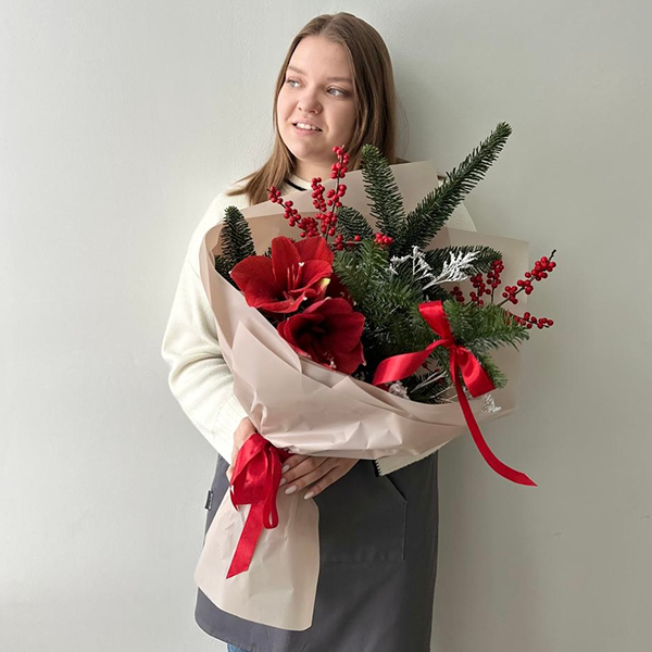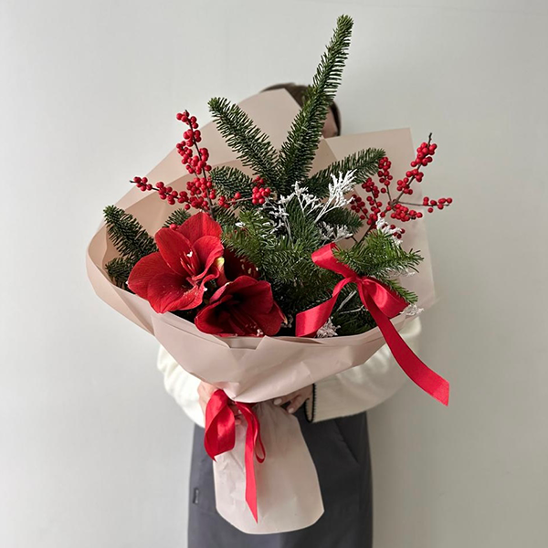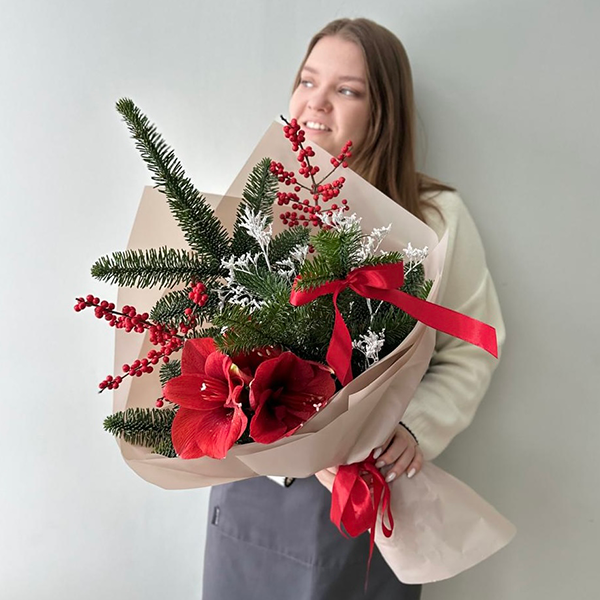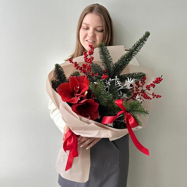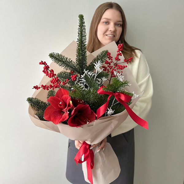Рождественский букет с нобилисом, амариллисом и илексом от 3500