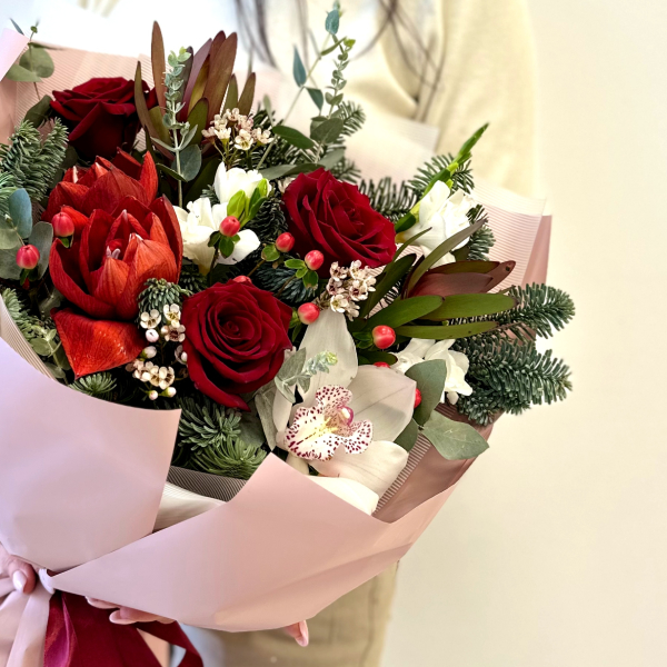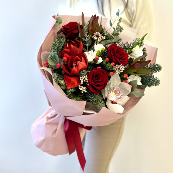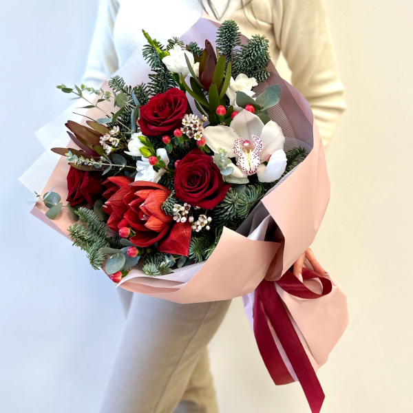 Орхидея, роза, амариллис (орхидея или хризантема), гиперикум, ваксфлауэрс, леукодендрон, эвкалипт, нобилис (датская ель), упаковка, лента атласная