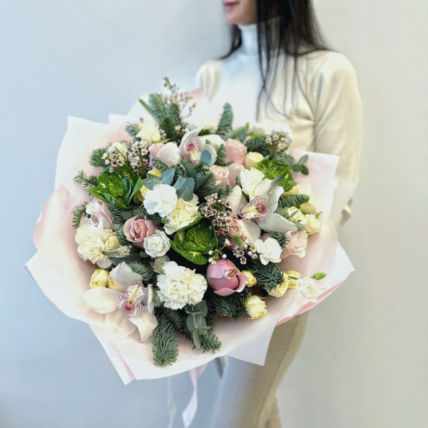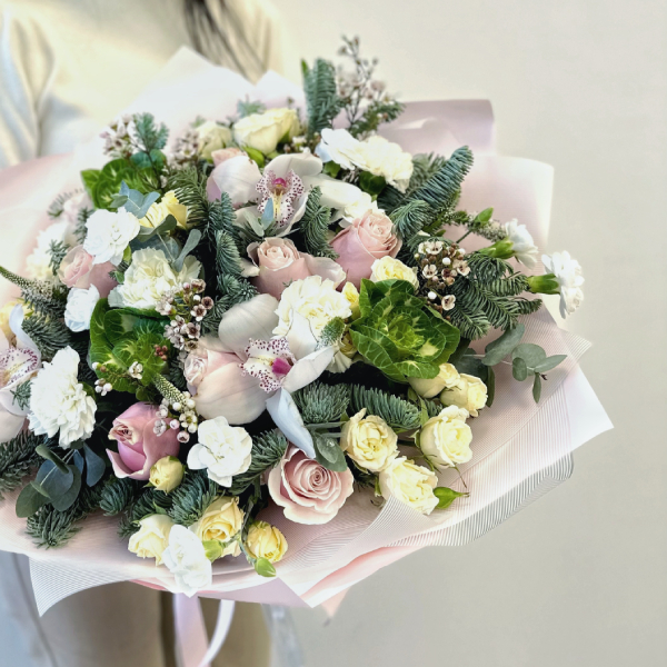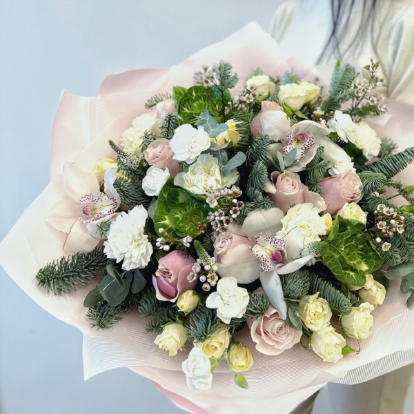 Орхидея, роза, роза кустовая диантус, диантус кустовой, брассика, ваксфлауэрс, эвкалипт, нобилис (датская ель), упаковка, лента атласная
