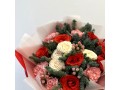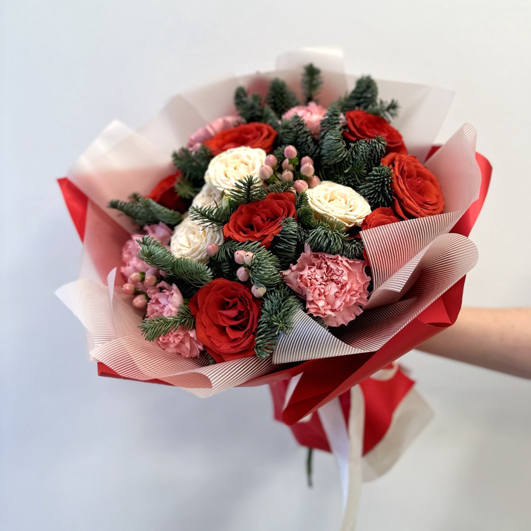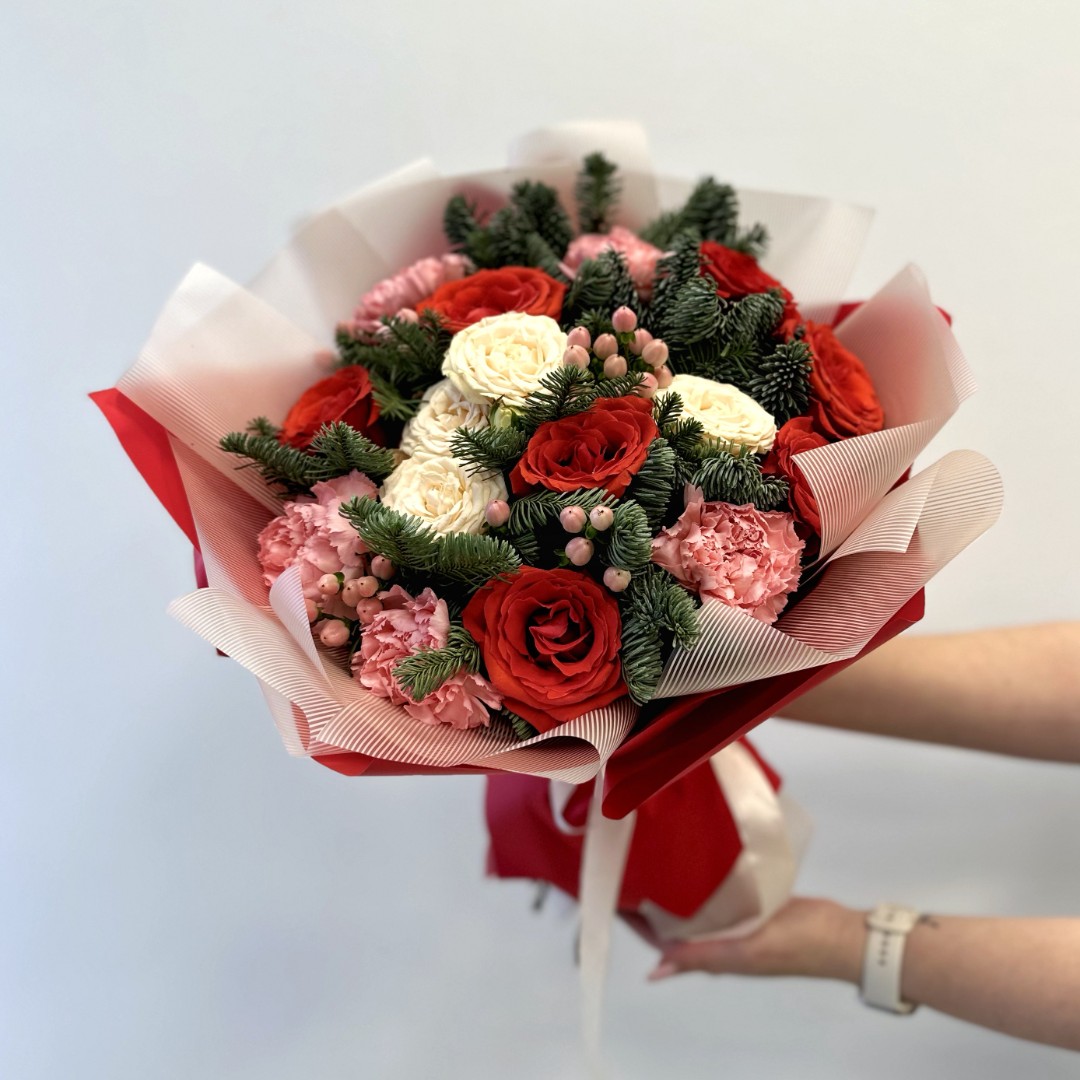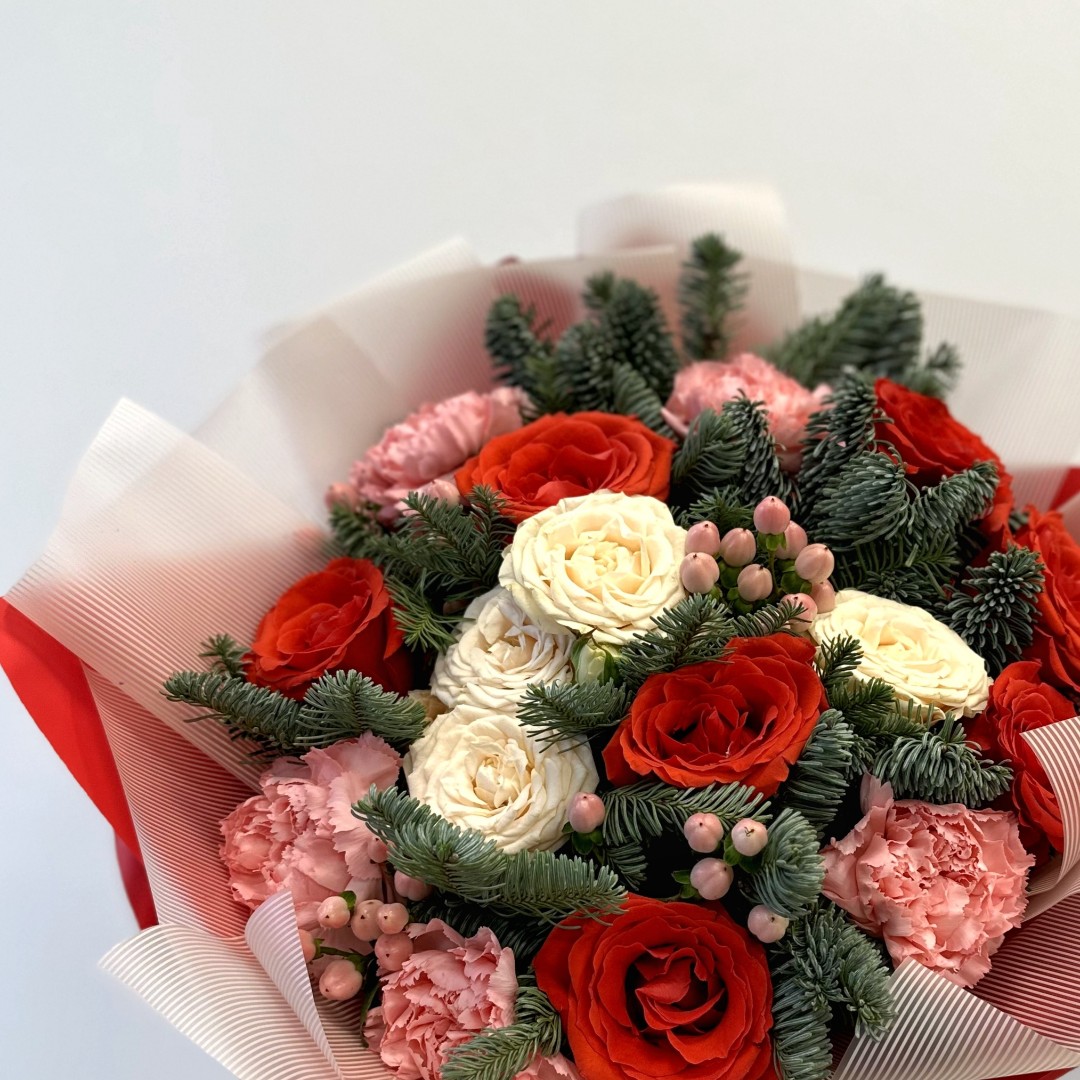 Роза, роза кустовая пионовидная, диантус, нобилис (датская ель), упаковка, лента атласная