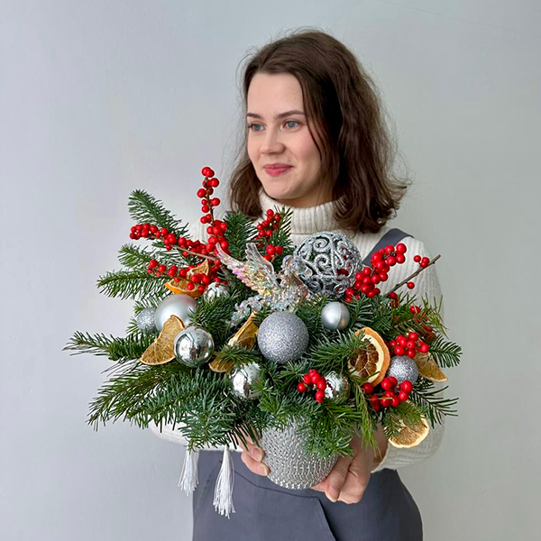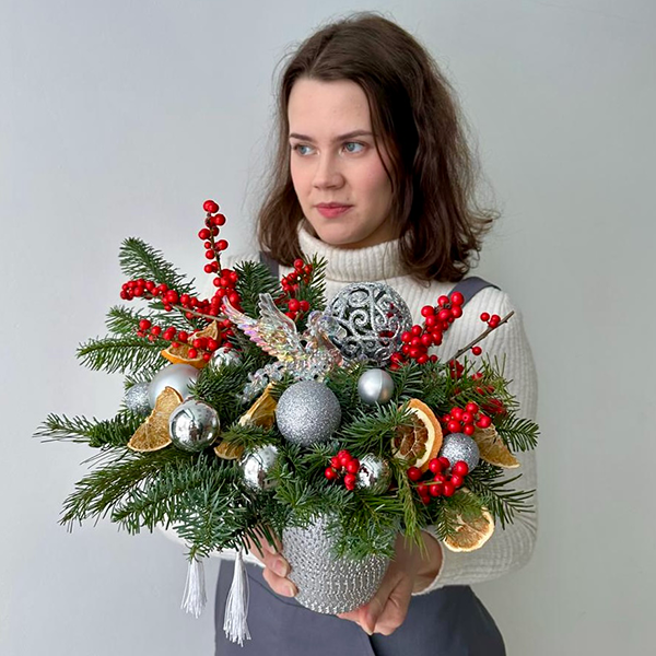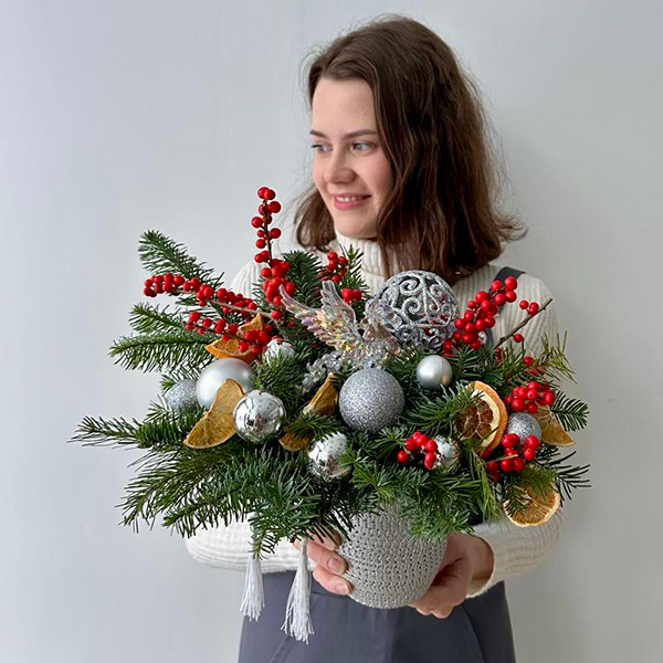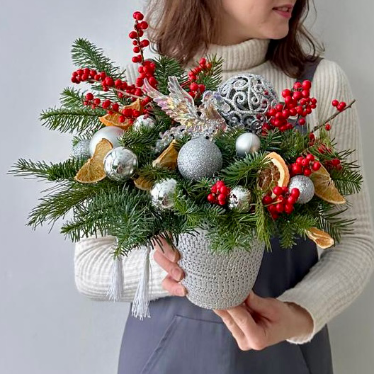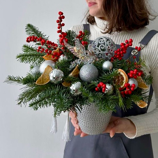 Композиция в керамическом кашпо из ароматной ели с новогодним декором популярна в этом сезоне, будет прекрасным подарком для друзей, любимых, коллег или украсит Ваш дом