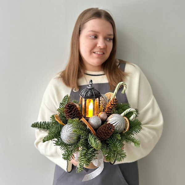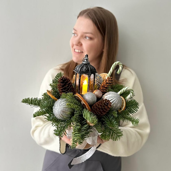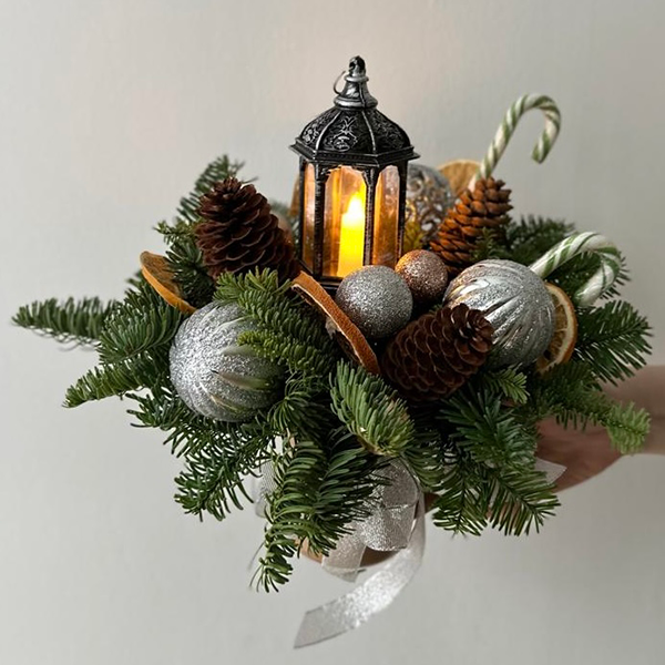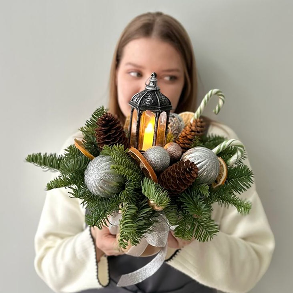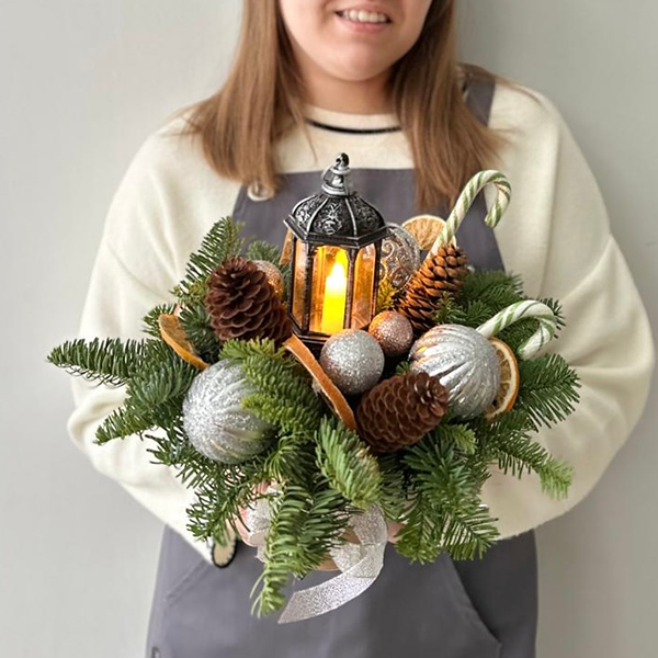 Нобилис (датская ель), фонарик, шишки, шары, декор, кружка или кашпо, пена флористическая