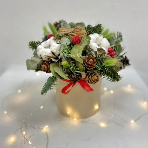 Нобилис (датская ель), хлопок, лагурус, эвкалипт, новогодний декор