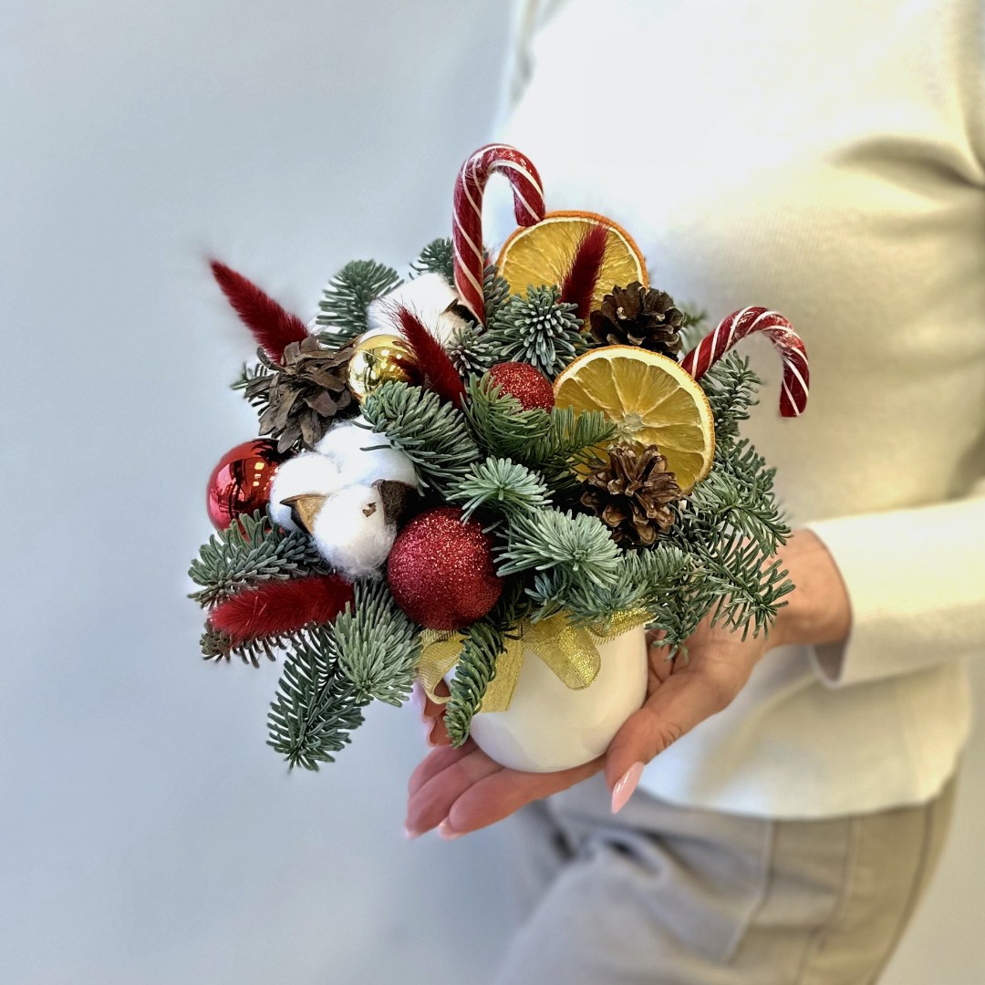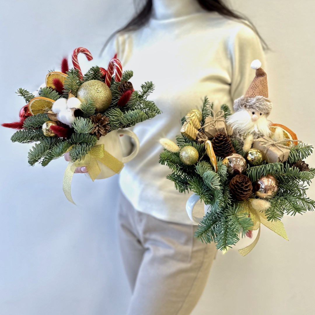 Композиция в кружке из ароматной ели с новогодним декором популярна в этом сезоне, будет прекрасным подарком для друзей, любимых, коллег или украсит Ваш дом.
