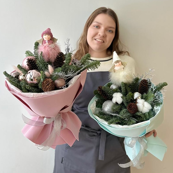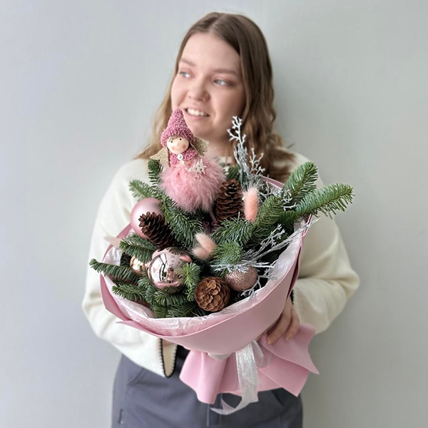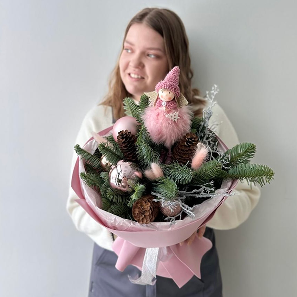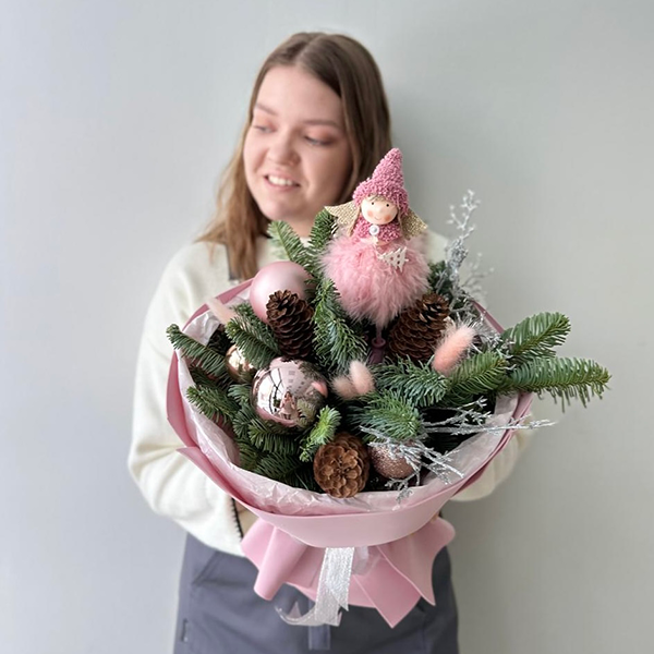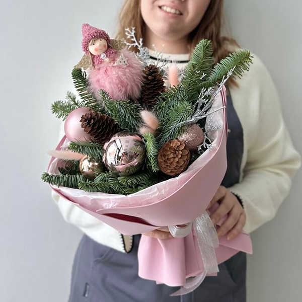 Розовый букет из нобилиса (датской ели) с шишками и новогодним декором